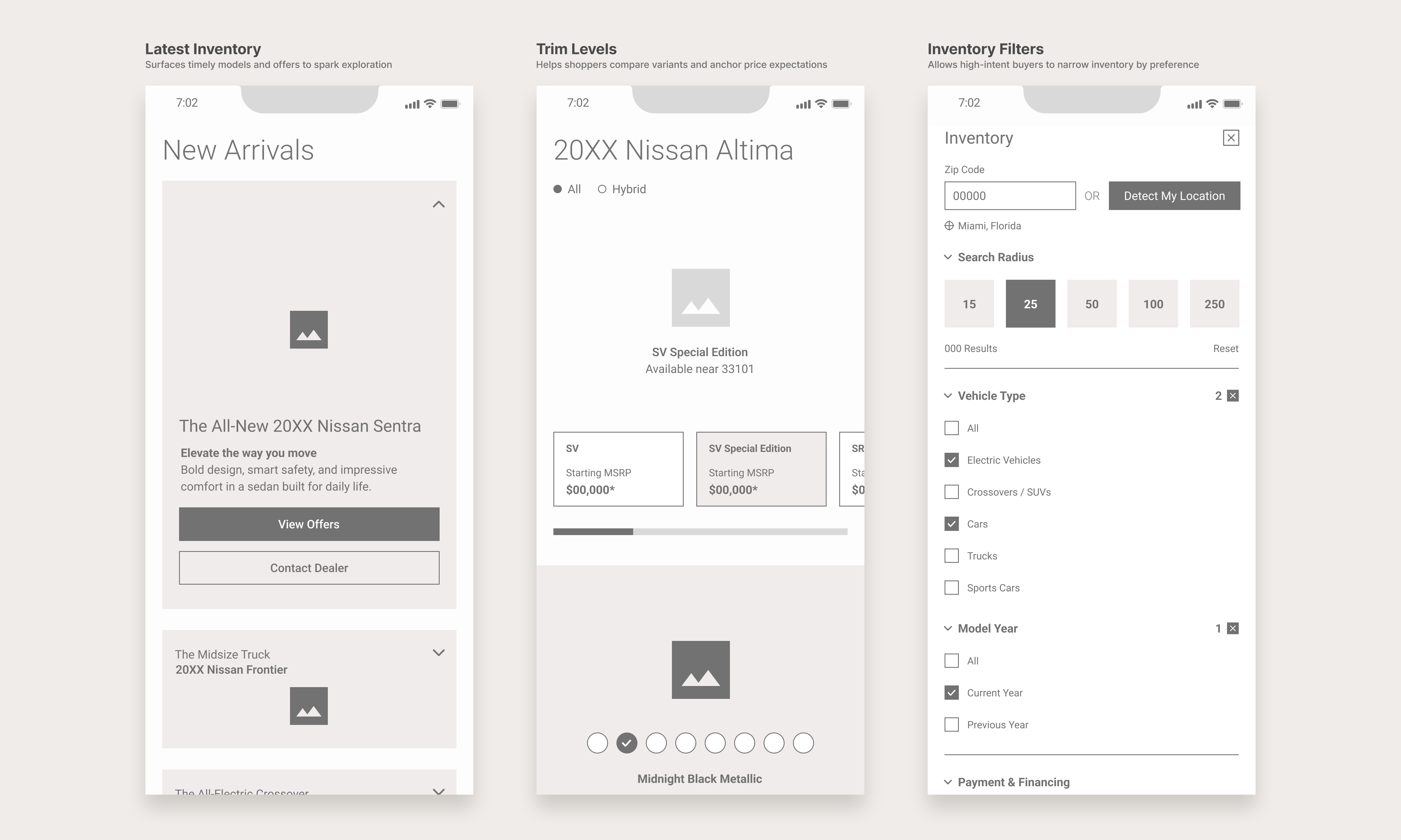 The structural logic of this redesign focuses on the "First 60 Seconds" of a user's visit. By prioritizing a high-density "New Arrivals" feed and a filtered inventory engine, I stripped away the traditional dealership clutter. This wireframe-first approach ensures that accessibility and regional offer visibility are baked into the site’s DNA, creating a reliable foundation for the high-fidelity visual experience.